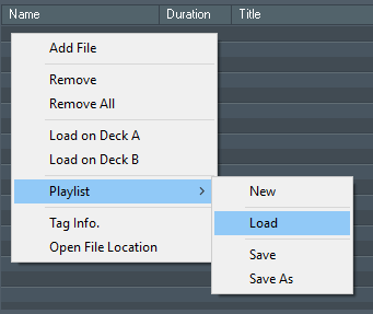 You can also load a saved playlist. Right-click your mouse on the track library and select Playlist, Load. Supported playlist formats are M3U, PLS, WPL, and PDJ.